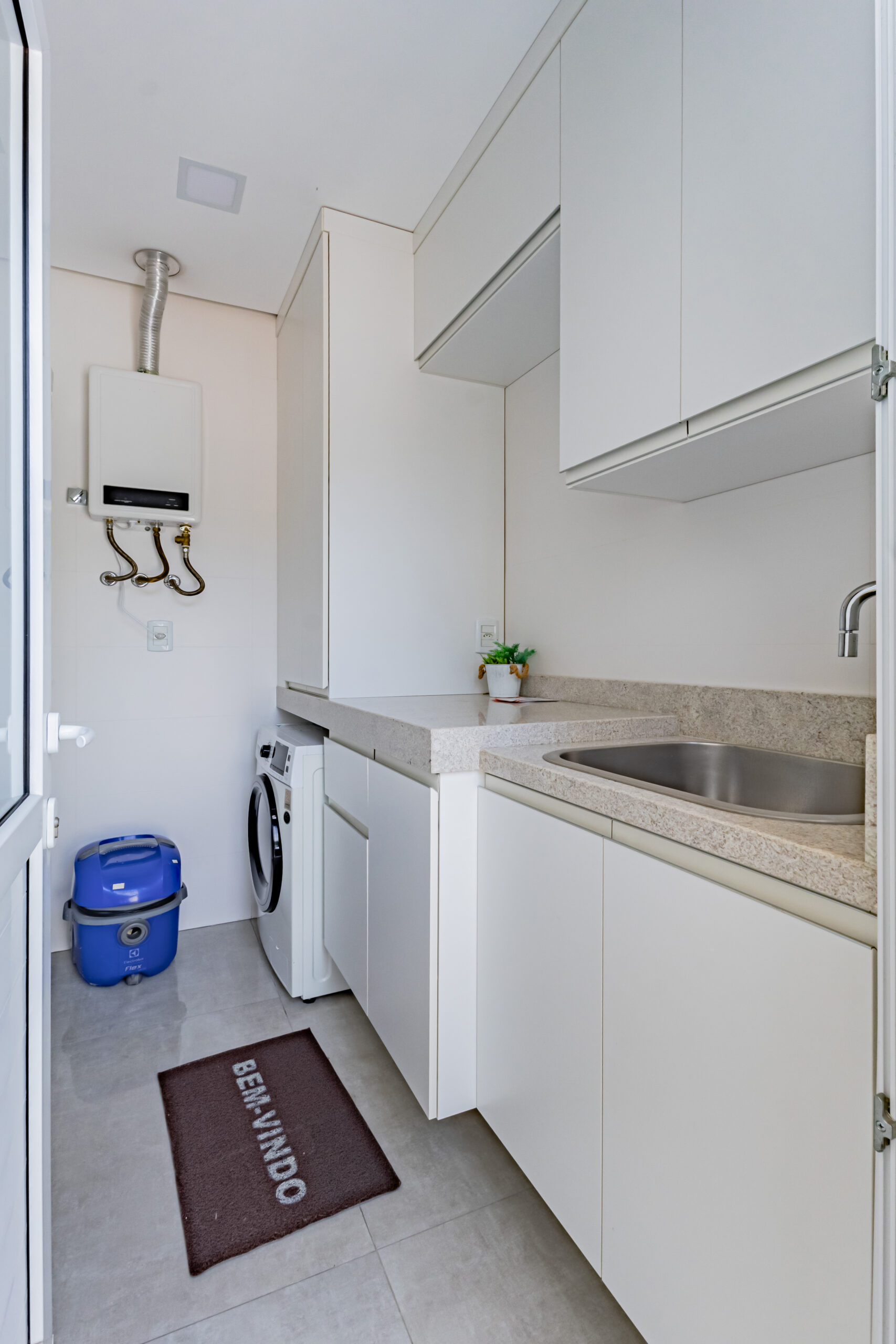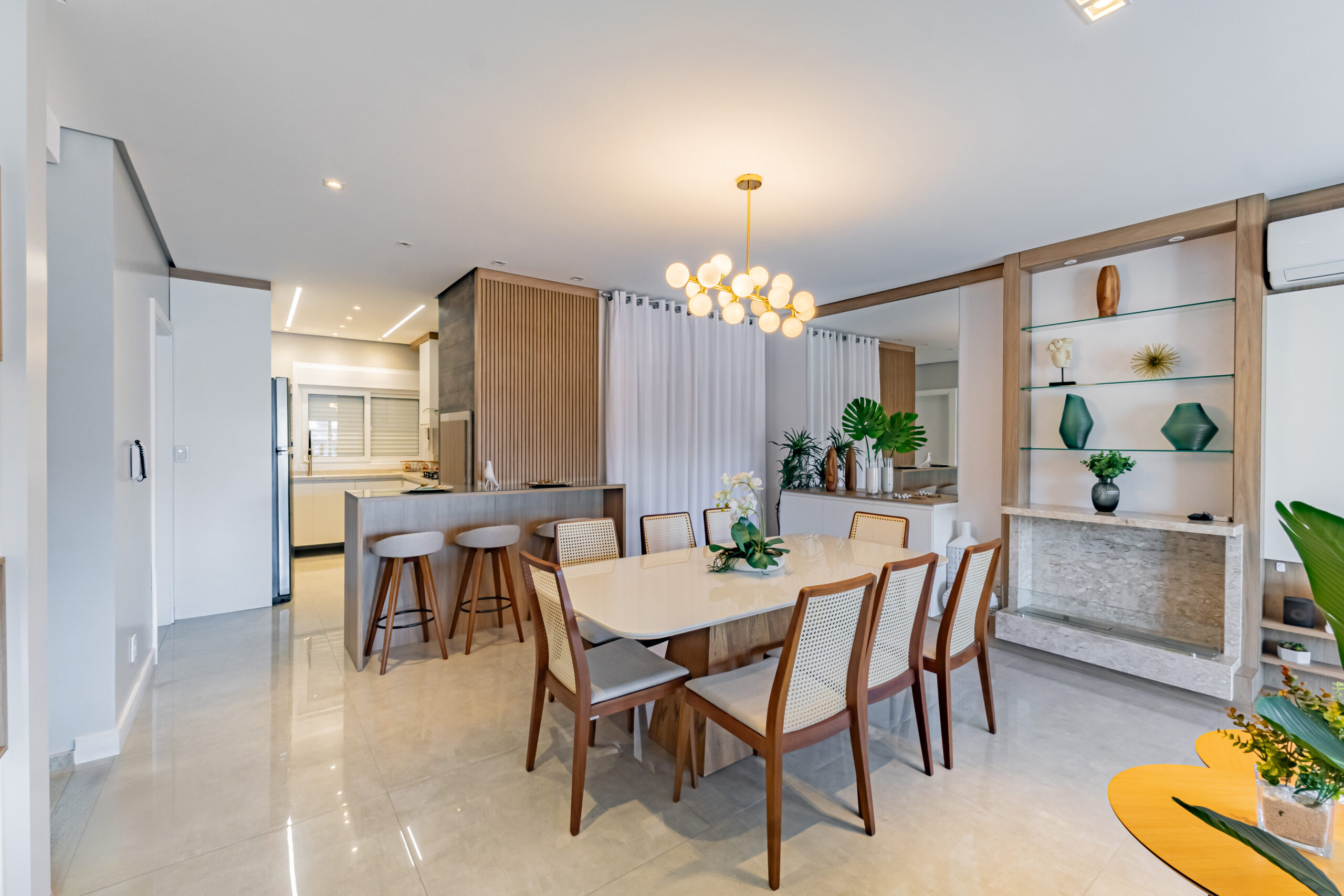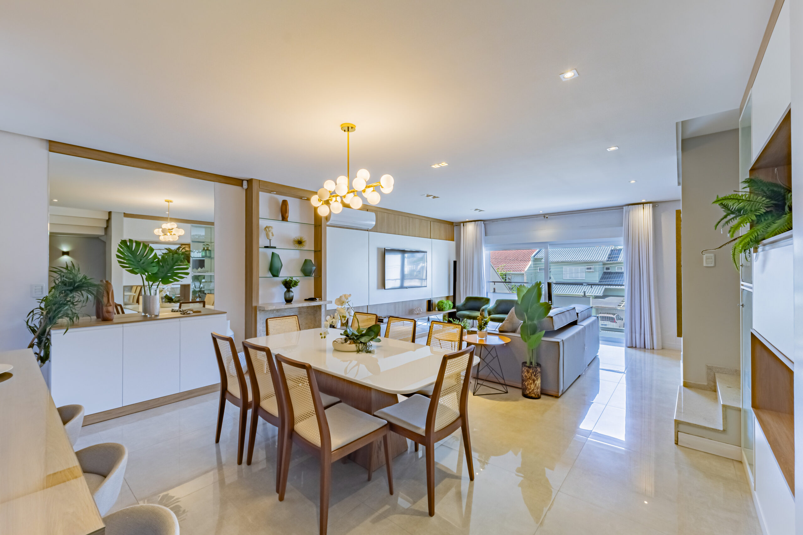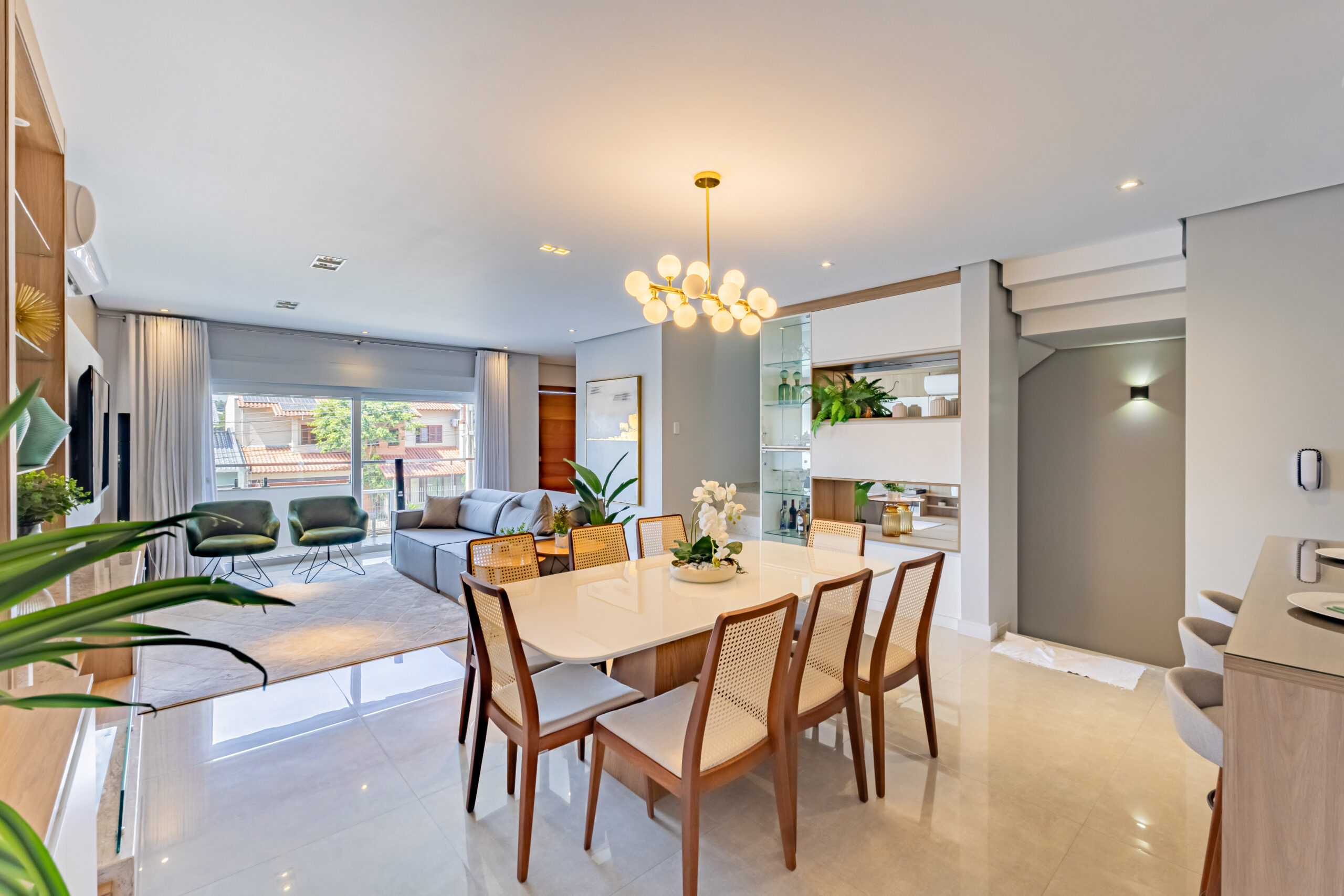 Sobrado mobiliado com arquitetura contemporânea, possuí 212,00m² de área construída e 199,50m² de área de terreno, garagem coberta para 2 automóveis um ao lado do outro (se contarmos o recuo frontal cabem 4 automóveis dentro da edificação), ampla área envidraçada garantindo uma iluminação e ventilação natural, frente com orientação solar voltada para leste e norte, jardim com belíssimo paisagismo e sistema de irrigação automátizado, escadas internas e externa em granito Itaúnas com acabamento em 45º, guarda-corpo em vidro e aço inoxidável, esquadrias em PVC com persianas, porcelanato polido 90cm x 90cm e demais cerâmicas da Portinari, água quente/fria, teto rebaixado em gesso e molduras de acabamento em toda a edificação, piso laminado em toda área íntima, rodapés em pvc branco, espera para gás central, acabamento com massa corrida. Andar Térreo: Garagem coberta para dois automóveis, central de gás, depósito, escada de acesso ao 2º pavimento; Segundo pavimento: Hall, lavabo, sala de estar com sacada, sala de jantar, área de serviço, cozinha em conceito aberto; acesso ao pátio, área externa gourmet com churrasqueira; Terceiro pavimento: Suíte com sacada, 2 dormitórios, sendo um deles com terraço, banheiro social